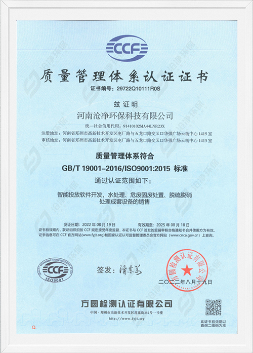 滄凈環保,是一家集科研、設計,工程施工、調試于一體的智能粉體投加系統-國家級高新技術企業【編號:GR202341000885】,旗下產品涵蓋水處理、危廢固廢處置,脫硫脫硝處理等領域,且通過ISO 9001:2015質量管理體系認證。